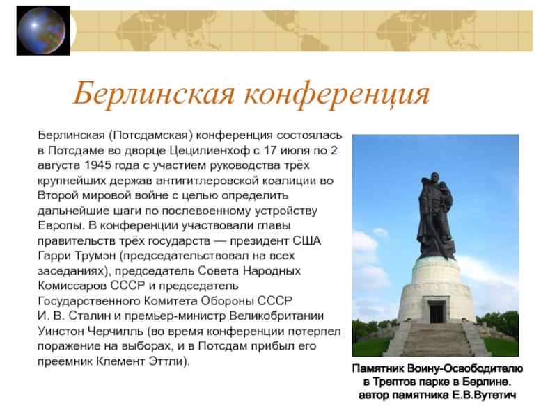 трёх крупнейших держав антигитлеровской коалиции во Второй мировой войне с целью определить дальнейшие шаги по послевоенному устройству Европы. В конференции участвовали главы правительств трёх государств — президент США Гарри Трумэн (председательствовал на всех заседаниях), председатель Совета Народных Комиссаров СССР и председатель Государственного Комитета Обороны СССР И. В. Сталин и премьер-министр Великобритании Уинстон Черчилль (во время конференции потерпел поражение на выборах, и в Потсдам прибыл его преемник Клемент Эттли).