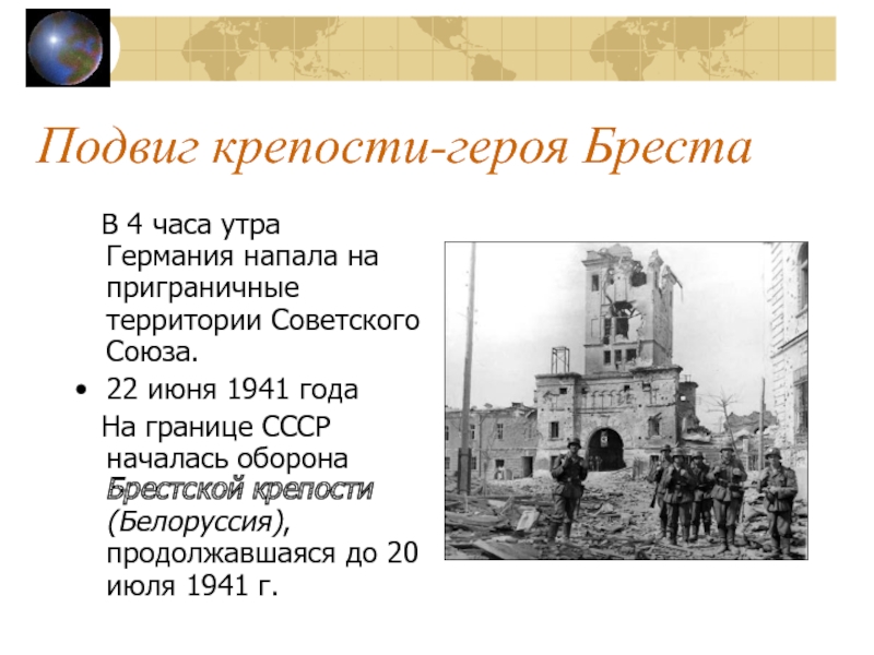 границе СССР началась оборона Брестской крепости (Белоруссия), продолжавшаяся до 20 июля 1941 г.