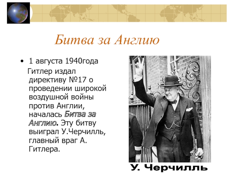 Англию. Эту битву выиграл У.Черчилль, главный враг А.Гитлера.