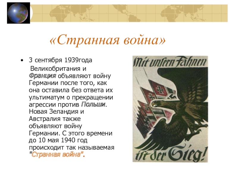 ультиматум о прекращении агрессии против Польши. Новая Зеландия и Австралия также объявляют войну Германии. С этого времени до 10 мая 1940 год происходит так называемая "Странная война".