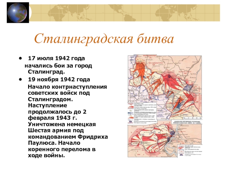 войск под Сталинградом. Наступление продолжалось до 2 февраля 1943 г. Уничтожена немецкая Шестая армия под командованием Фридриха Паулюса. Начало коренного перелома в ходе войны.