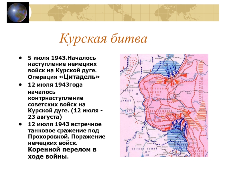 12 июля 1943 встречное танковое сражение под Прохоровкой. Поражение немецких войск. Коренной перелом в ходе войны.