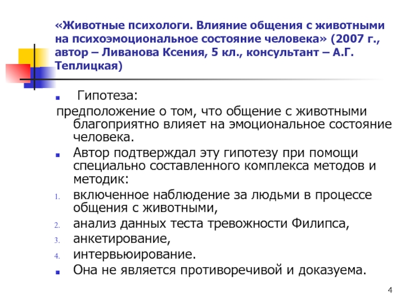 Слайд 4«Животные психологи. Влияние общения с животными на психоэмоциональное состояние человека»