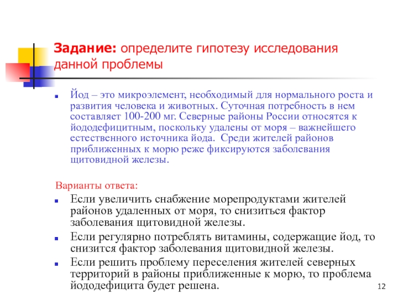 Слайд 12Задание: определите гипотезу исследования данной проблемы