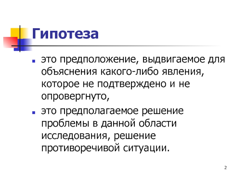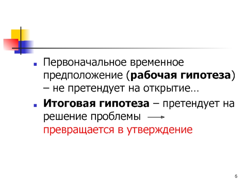 Слайд 6Первоначальное временное предположение (рабочая гипотеза) – не претендует на открытие…