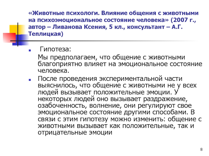 Слайд 8«Животные психологи. Влияние общения с животными на психоэмоциональное состояние человека»