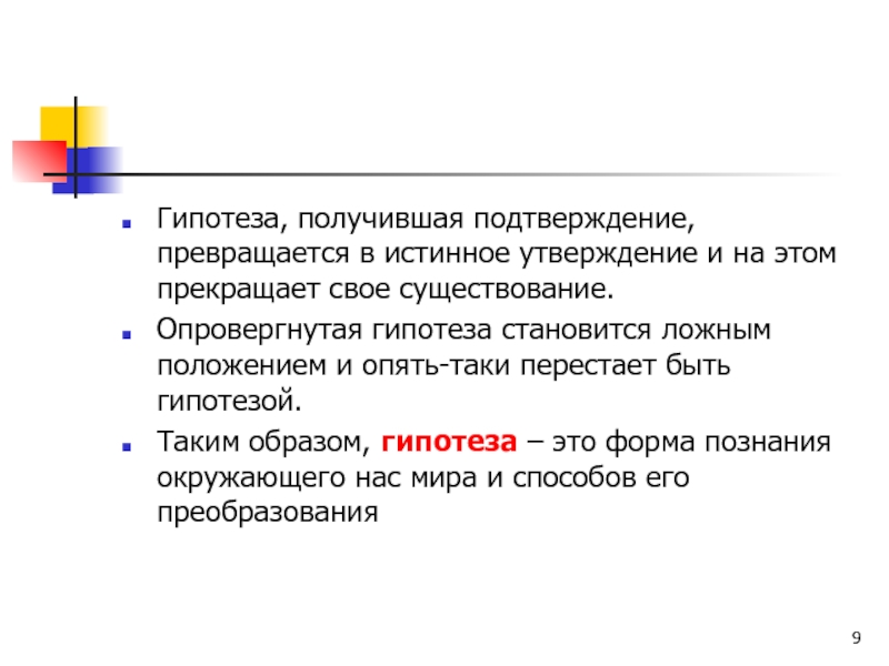 Слайд 9Гипотеза, получившая подтверждение, превращается в истинное утверждение и на этом