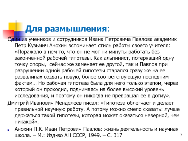 в нем то, что он не мог ни минуты работать без законченной рабочей гипотезы. Как альпинист, потерявший одну точку опоры, сейчас же заменяет ее другой, так и Павлов при разрушении одной рабочей гипотезы старался сразу же на ее развалинах создать новую, более соответствующую последним фактам… Но рабочая гипотеза была для него только этапом, через который он проходил, поднимаясь на более высокий уровень исследования, и поэтому он никогда не превращал ее в догму».