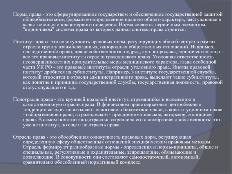 взаимосогласованных норм, субинститутов, институтов, подотраслей и отраслей права.