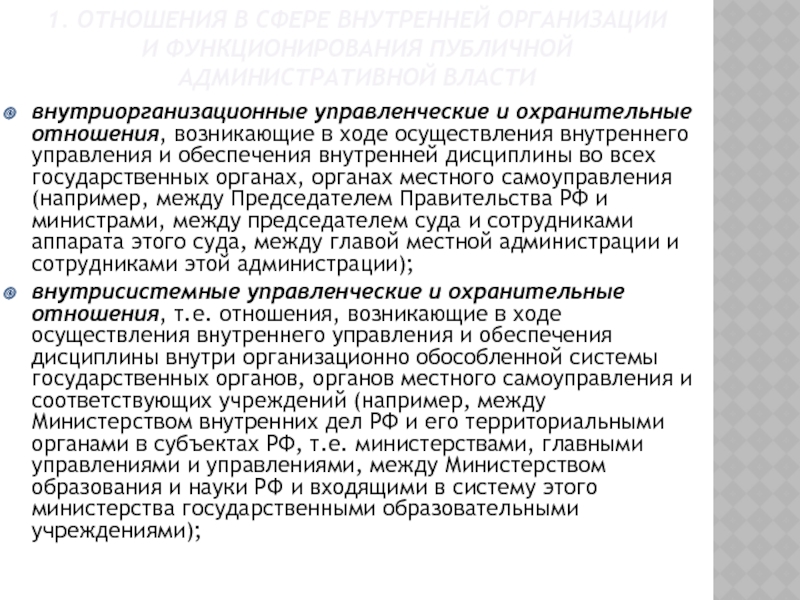 2. Внутренние или внутриорганизационные отношения – управленческие отношения внутри органов государственного управления, а также в законодательных, судебных и иных государственных органах (внутренняя управленческая деятельность).