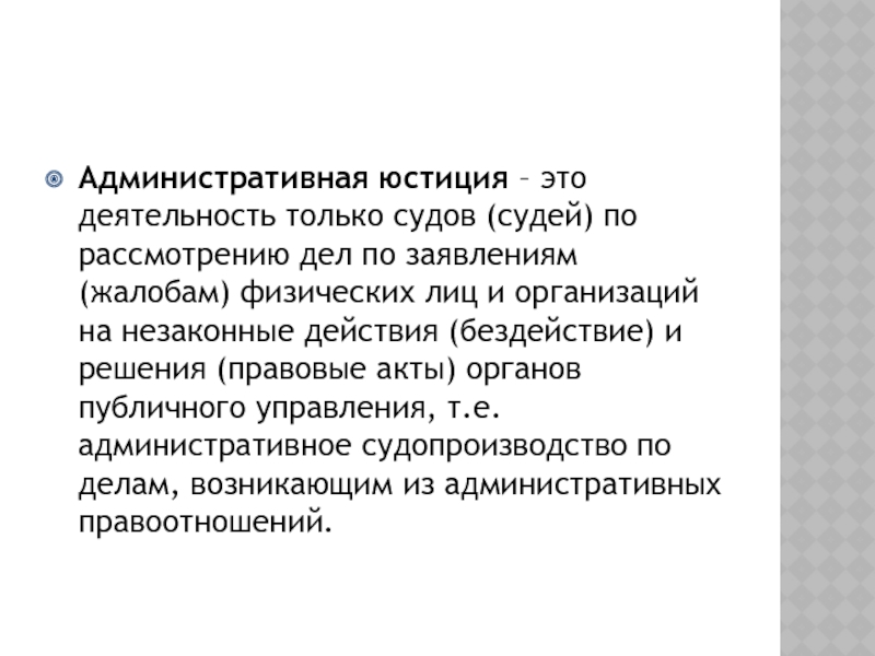 Слайд 31Административная юстиция – это деятельность только судов (судей) по рассмотрению