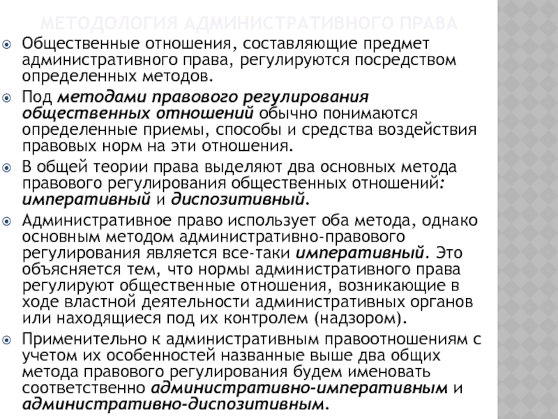 Административное право использует оба метода, однако основным методом административно-правового регулирования является все-таки императивный. Это объясняется тем, что нормы административного права регулируют общественные отношения, возникающие в ходе властной деятельности административных органов или находящиеся под их контролем (надзором).