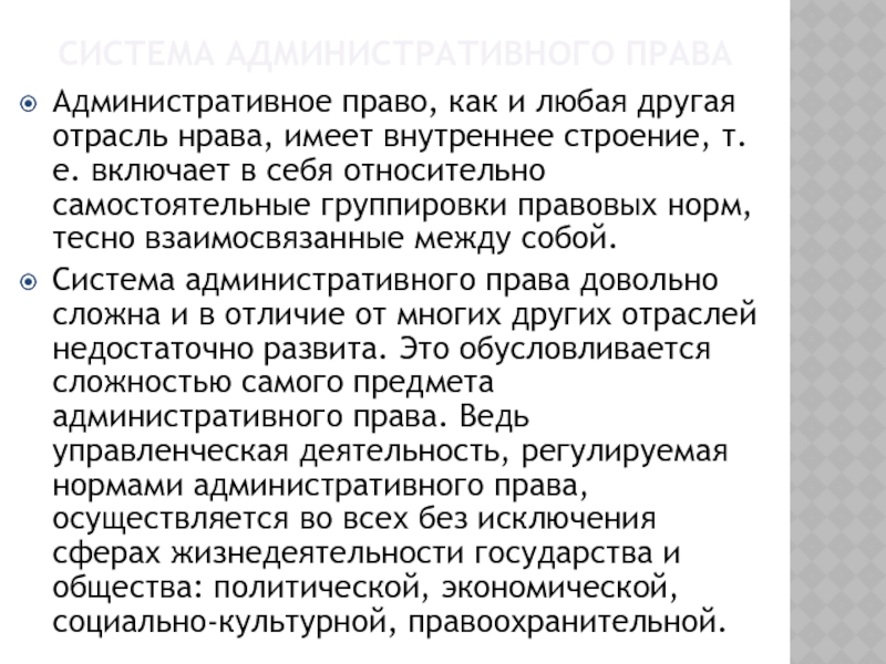 Система административного права довольно сложна и в отличие от многих других отраслей недостаточно развита. Это обусловливается сложностью самого предмета административного права. Ведь управленческая деятельность, регулируемая нормами административного права, осуществляется во всех без исключения сферах жизнедеятельности государства и общества: политической, экономической, социально-культурной, правоохранительной.