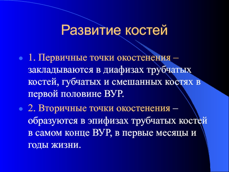 точки окостенения – образуются в эпифизах трубчатых костей в самом конце ВУР, в первые месяцы и годы жизни.