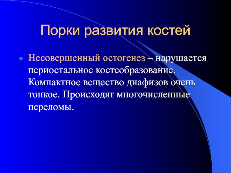 Несовершенный остогенез – нарушается периостальное костеобразование. Компактное вещество