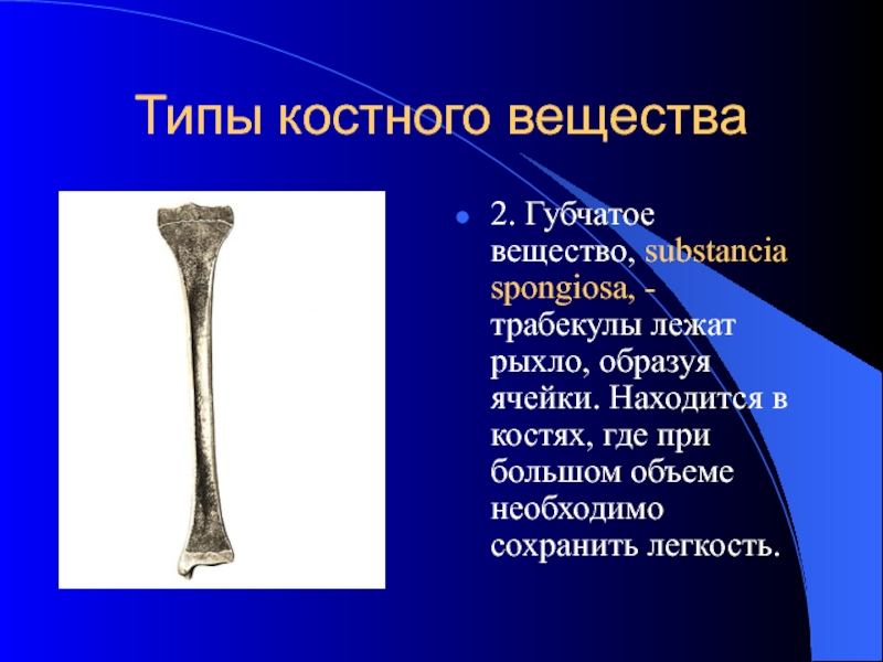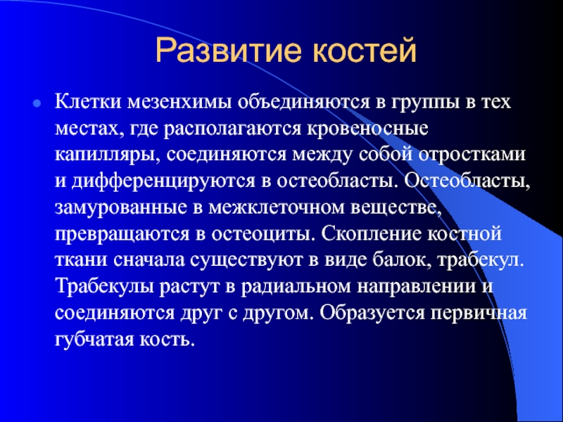 остеобласты. Остеобласты, замурованные в межклеточном веществе, превращаются в остеоциты. Скопление костной ткани сначала существуют в виде балок, трабекул. Трабекулы растут в радиальном направлении и соединяются друг с другом. Образуется первичная губчатая кость.