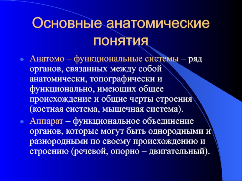 Аппарат – функциональное объединение органов, которые могут быть однородными и разнородными по своему происхождению и строению (речевой, опорно – двигательный).