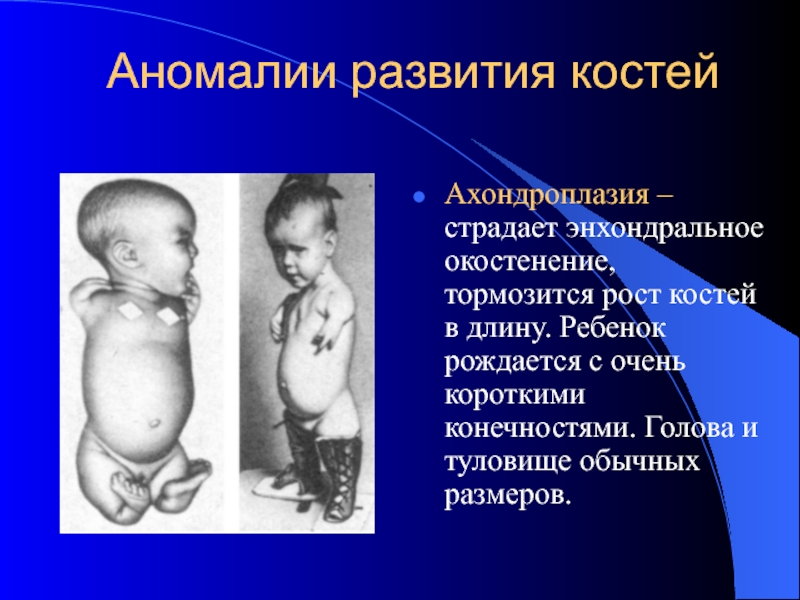 Ахондроплазия – страдает энхондральное окостенение, тормозится рост костей