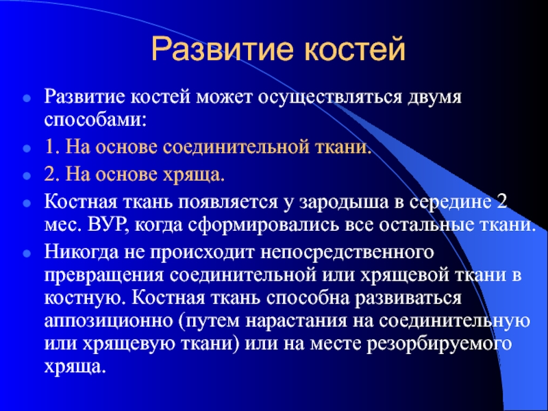 1. В соединительнотканной основе окостенение начинается раньше, чем