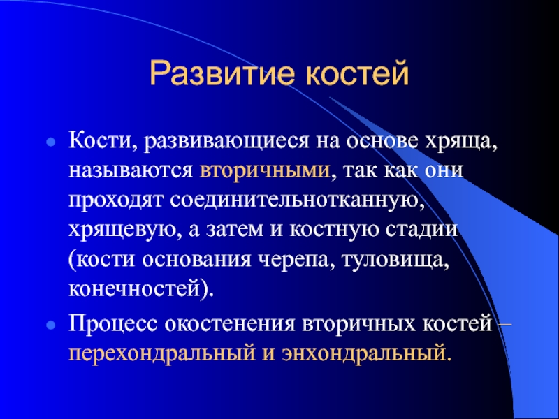 Процесс окостенения вторичных костей – перехондральный и энхондральный.