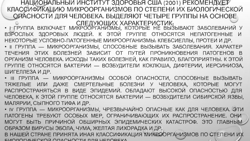 В нашей стране принята иная классификация микроорганизмов по степени их биологической опасности для человека.