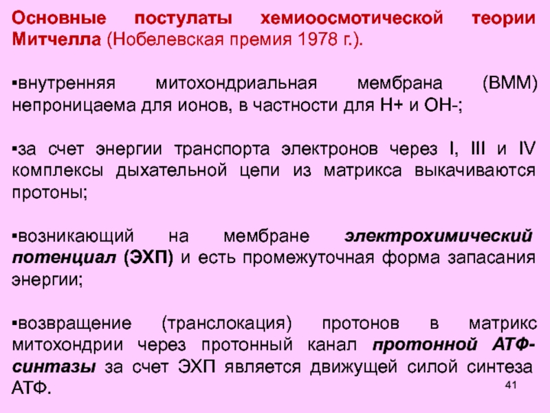Слайд 41Основные постулаты хемиоосмотической теории Митчелла (Нобелевская премия 1978 г.).