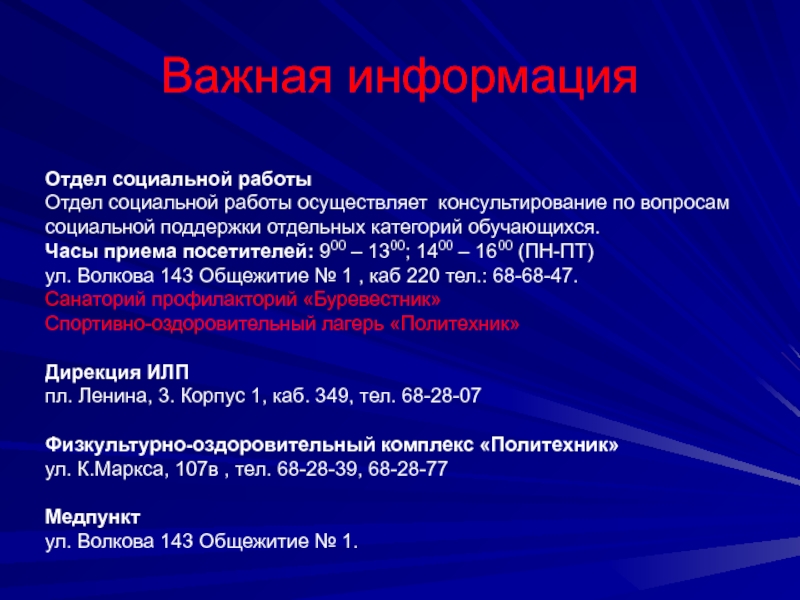 ул. Волкова 143 Общежитие № 1 , каб 220 тел.: 68-68-47.