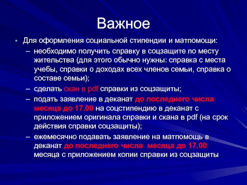 ежемесячно подавать заявление на матпомощь в деканат до последнего числа месяца до 17.00 месяца с приложением копии справки из соцзащиты