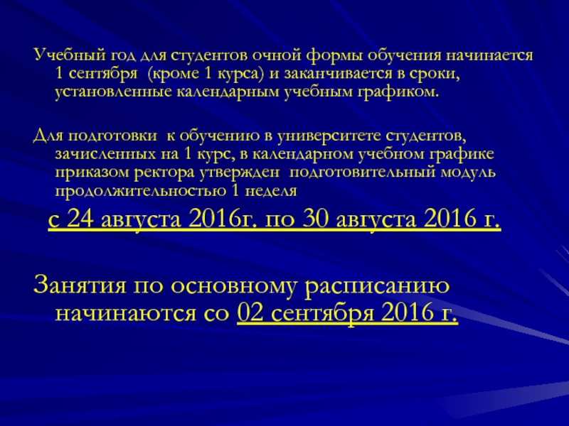 Слайд 9Учебный год для студентов очной формы обучения начинается 1 сентября
