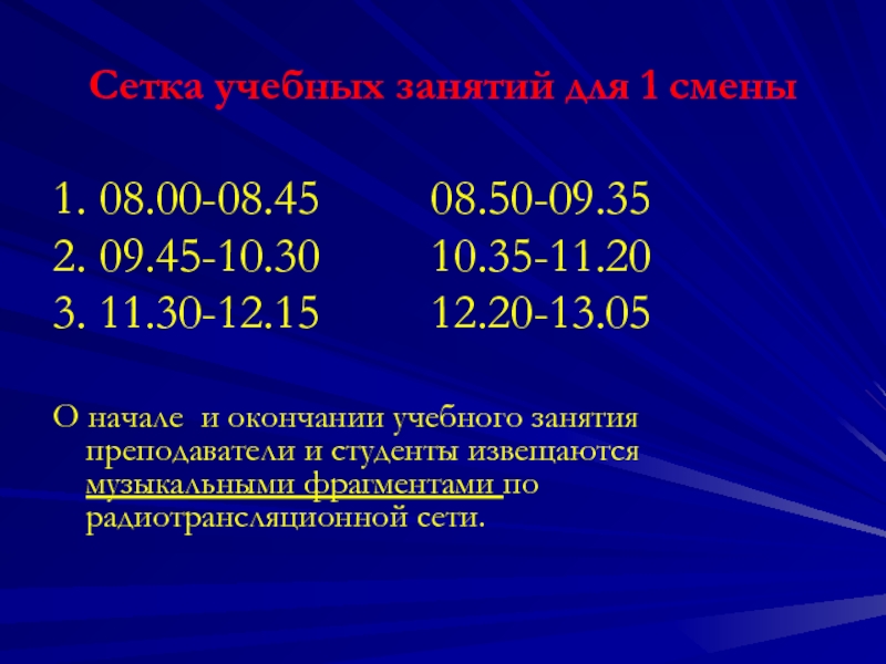 О начале и окончании учебного занятия преподаватели и студенты извещаются музыкальными фрагментами по радиотрансляционной сети.