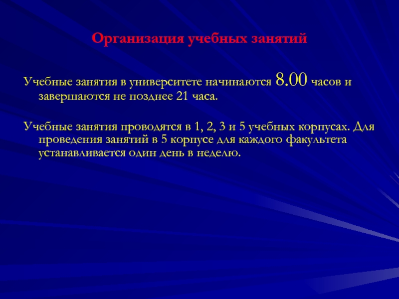 2, 3 и 5 учебных корпусах. Для проведения занятий в 5 корпусе для каждого факультета устанавливается один день в неделю.