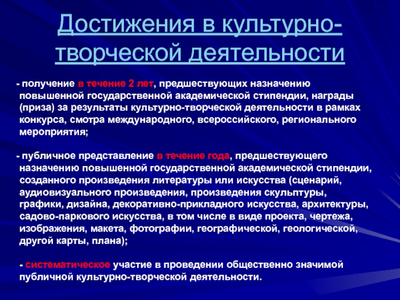 публичное представление в течение года, предшествующего назначению повышенной государственной академической стипендии, созданного произведения литературы или искусства (сценарий, аудиовизуального произведения, произведения скульптуры, графики, дизайна, декоративно-прикладного искусства, архитектуры, садово-паркового искусства, в том числе в виде проекта, чертежа, изображения, макета, фотографии, географической, геологической, другой карты, плана);