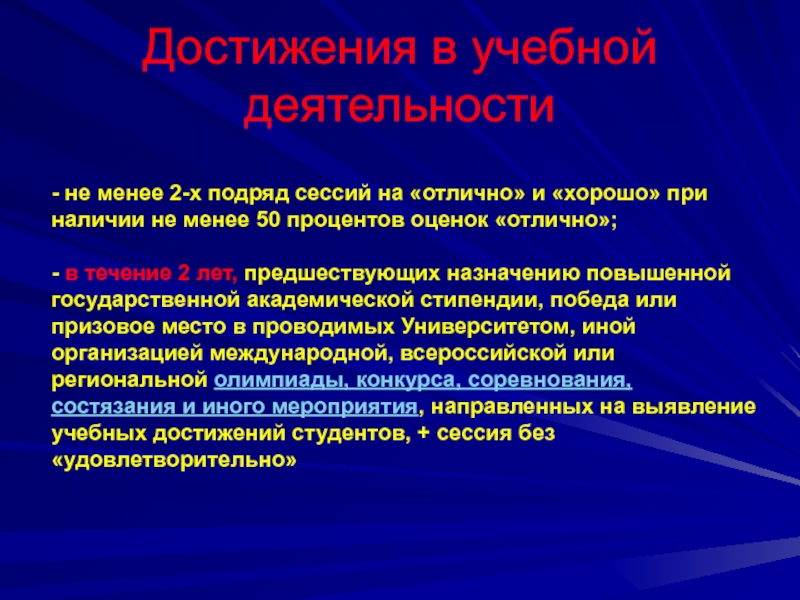 - в течение 2 лет, предшествующих назначению повышенной государственной академической стипендии, победа или призовое место в проводимых Университетом, иной организацией международной, всероссийской или региональной олимпиады, конкурса, соревнования, состязания и иного мероприятия, направленных на выявление учебных достижений студентов, + сессия без «удовлетворительно»