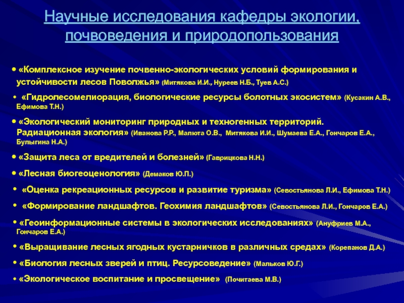 Слайд 41Научные исследования кафедры экологии, почвоведения и природопользования