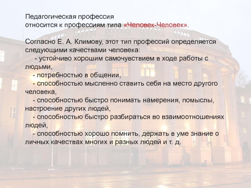 Слайд 8По Е. А. Климову, человеку этого типа свойственны: