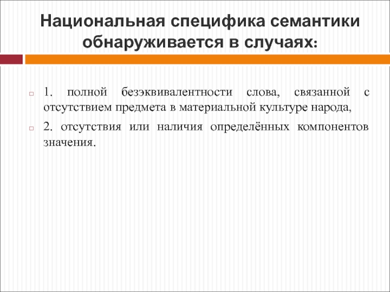 Слайд 71Национальная специфика семантики обнаруживается в случаях: