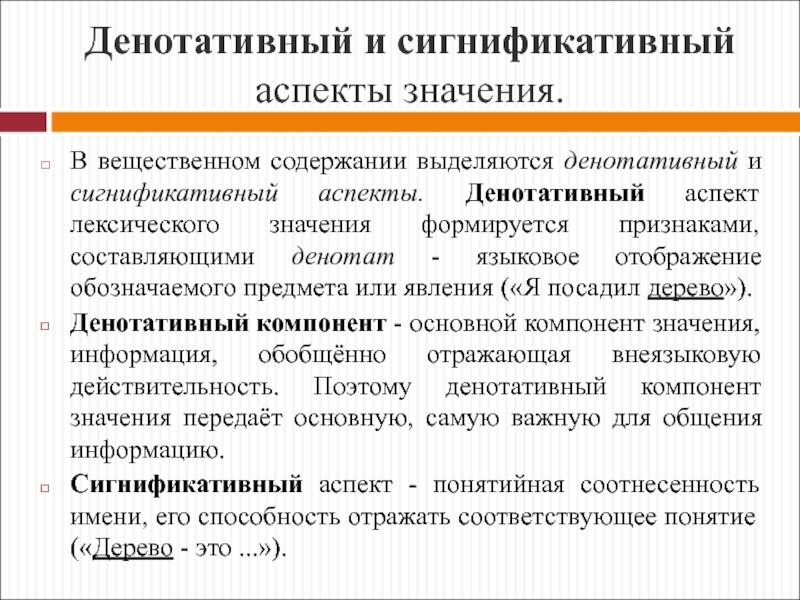 Эта связь (соотнесенность) слова с явлениями реальной действительности (денотатами), имеющая нелингвистический характер, но являющаяся важнейшим фактором в определении природы слова как знаковой единицы, понимается как значение слова.