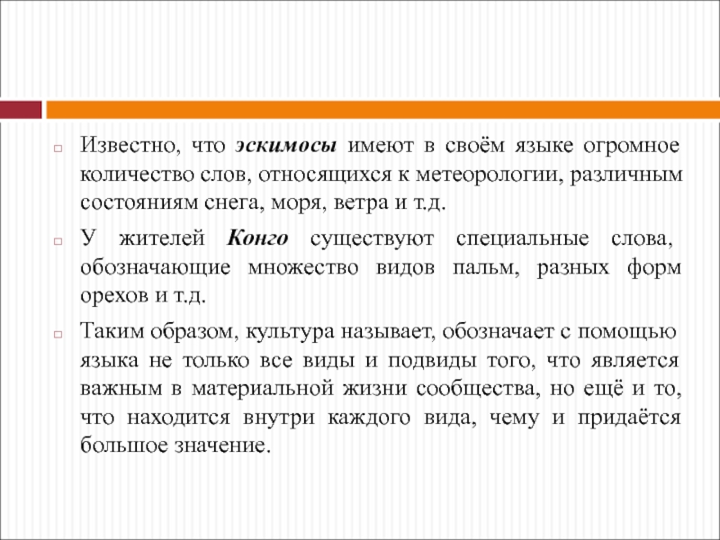 Таким образом, культура называет, обозначает с помощью языка не только все виды и подвиды того, что является важным в материальной жизни сообщества, но ещё и то, что находится внутри каждого вида, чему и придаётся большое значение.
