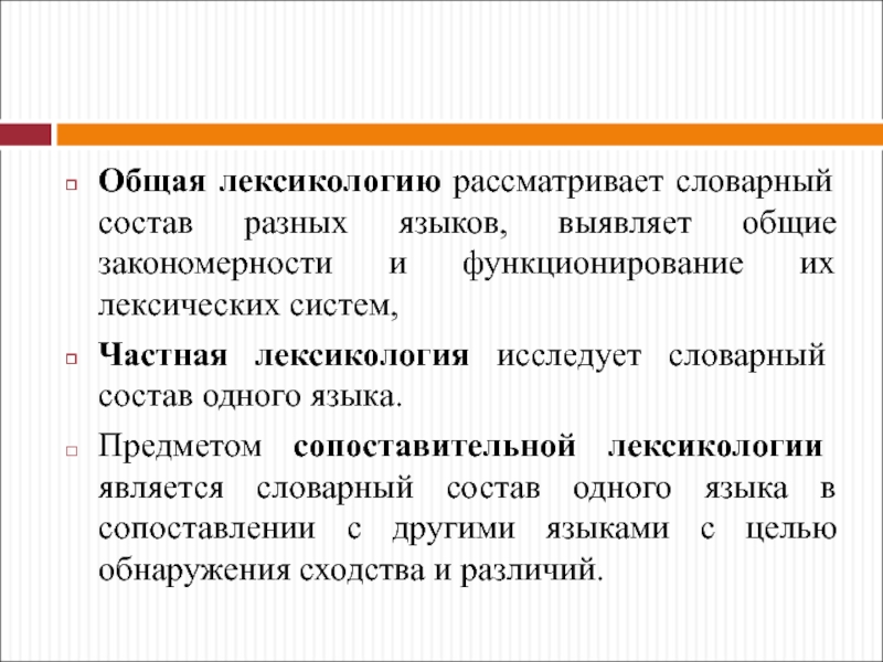 Слайд 7Общая лексикологию рассматривает словарный состав разных языков, выявляет общие закономерности