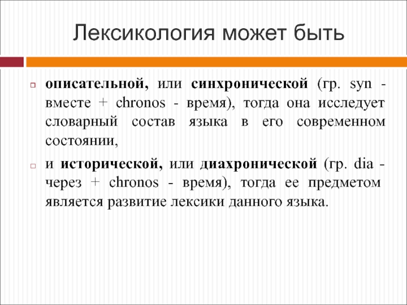и исторической, или диахронической (гр. dia - через + chronos - время), тогда ее предметом является развитие лексики данного языка.