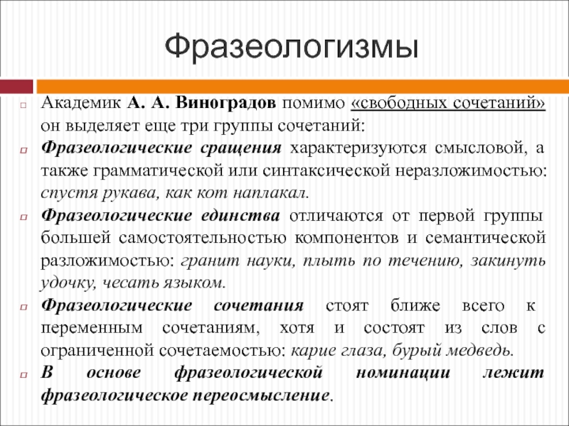 содержательное наполнение в трудах В. В. Виноградова (1938, 1944, 1947),