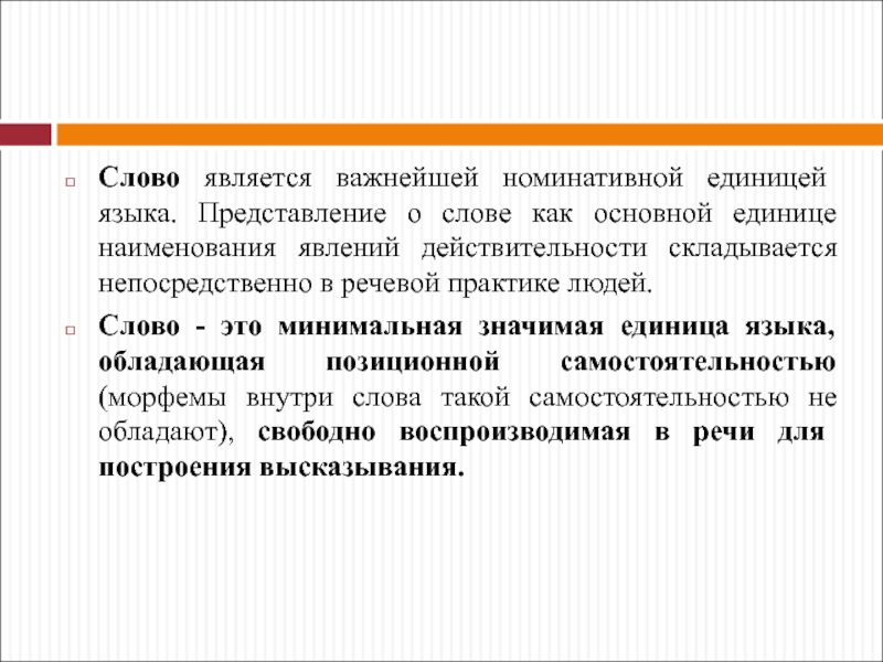 Слайд 11Слово является важнейшей номинативной единицей языка. Представление о слове как
