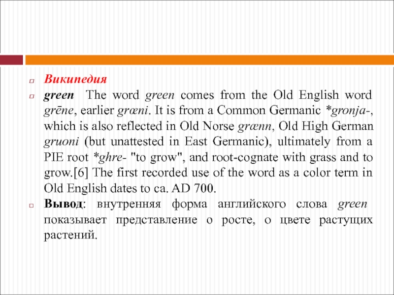Вывод: внутренняя форма английского слова green показывает представление о росте, о цвете растущих растений.