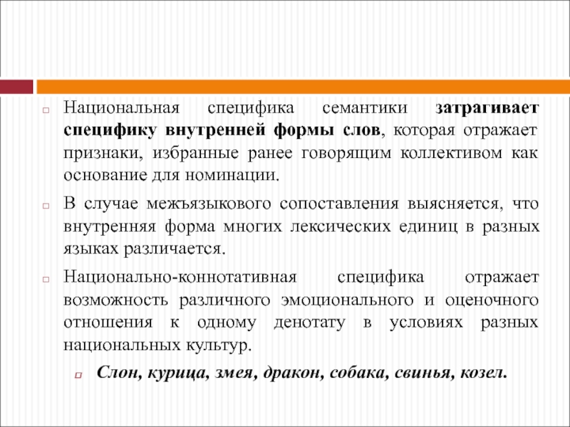 Слайд 73Национальная специфика семантики затрагивает специфику внутренней формы слов, которая отражает