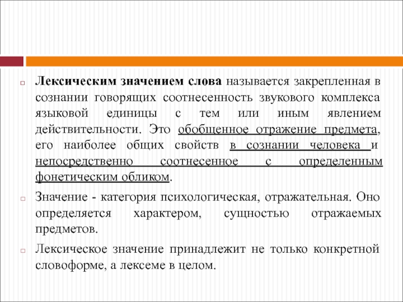 Слайд 16Лексическим значением слова называется закрепленная в сознании говорящих соотнесенность звукового