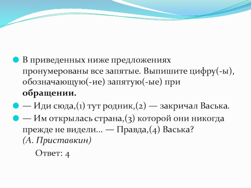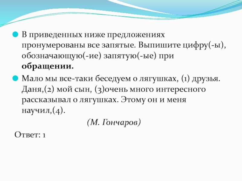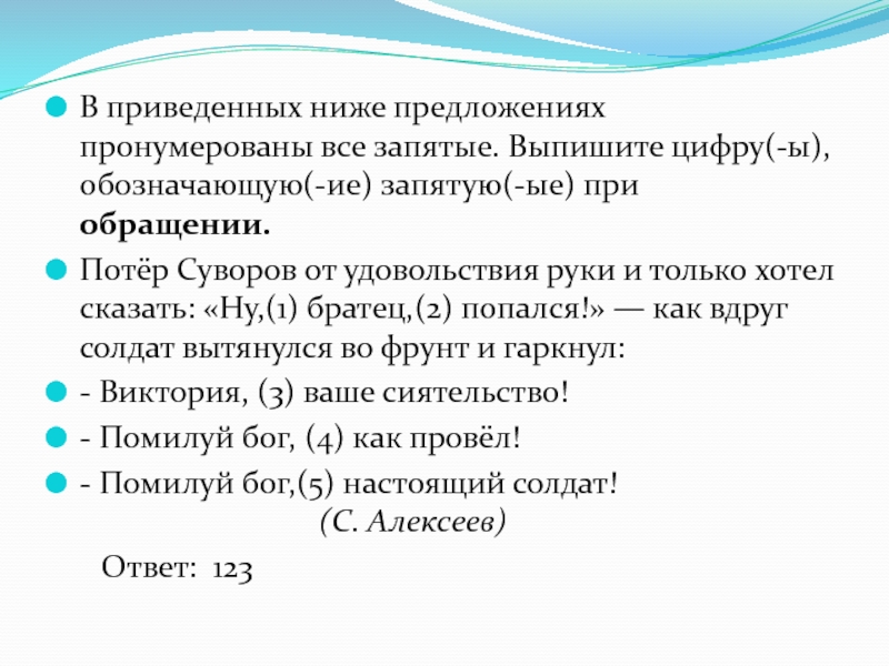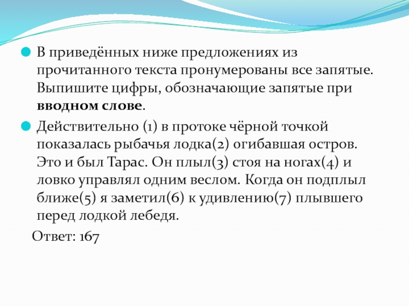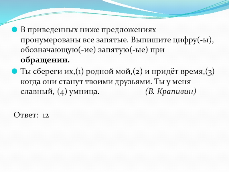 Слайд 82В приведенных ниже предложениях пронумерованы все запятые. Выпишите цифру(-ы), обозначающую(-ие)