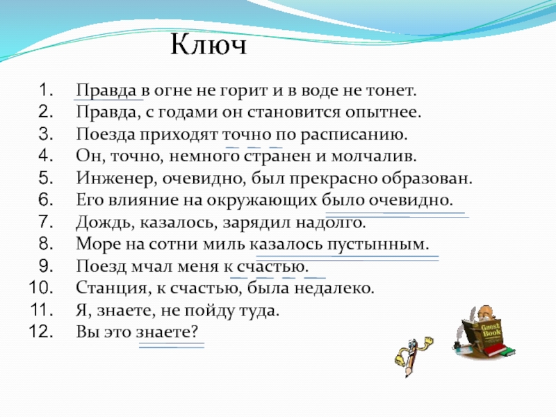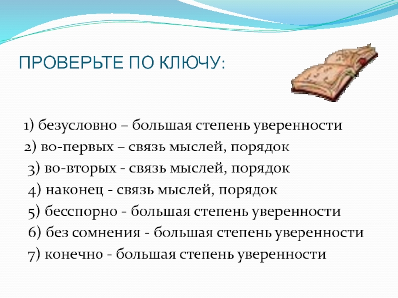 несомненно, без всякого сомнения, очевидно, безусловно, разумеется, само собой разумеется, бесспорно, действительно, наверное, возможно, верно, вероятно, по всей вероятности, может, может быть, быть может, должно быть, кажется, казалось бы, видимо, по-видимому, пожалуй, в самом деле, правда, не правда ли, в сущности, по существу, по сути, право, чай, надо полагать, думаю, надеюсь, полагаю и др.