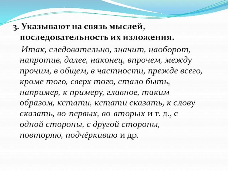 Слайд 73. Указывают на связь мыслей, последовательность их изложения.