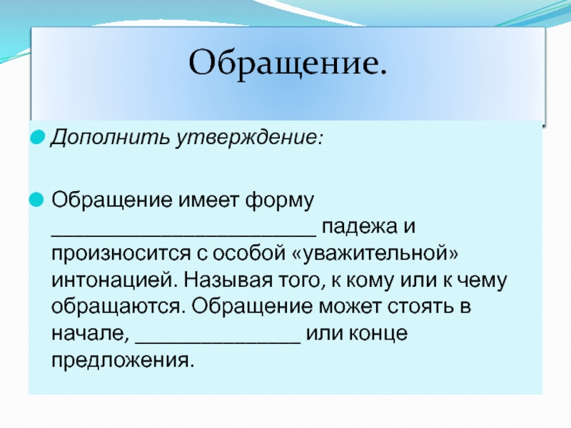 обращаются. Обращение может стоять в начале, _______________ или конце предложения.
