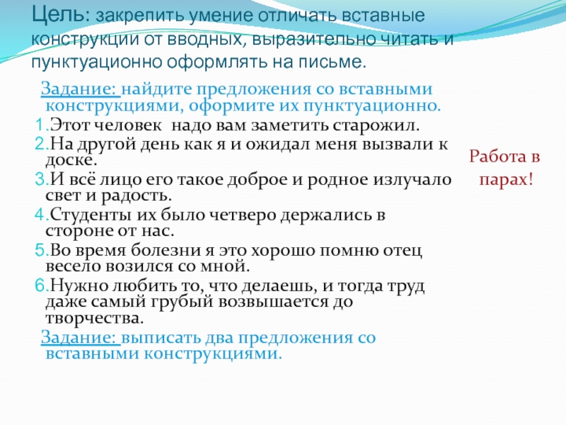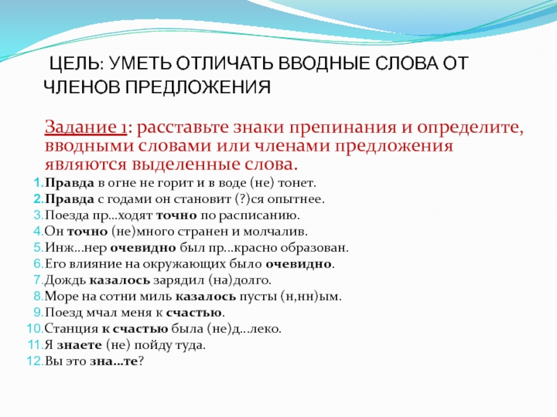 не являются частями предложения, а осложняют простое предложение (или сложное). Вводные предложения выражают отношение говорящего к содержанию высказывания, а вставные конструкции содержат добавочные замечания, попутные уточнения. При вводных предложениях ставятся чаще всего запятые, а при вставных — тире или скобки